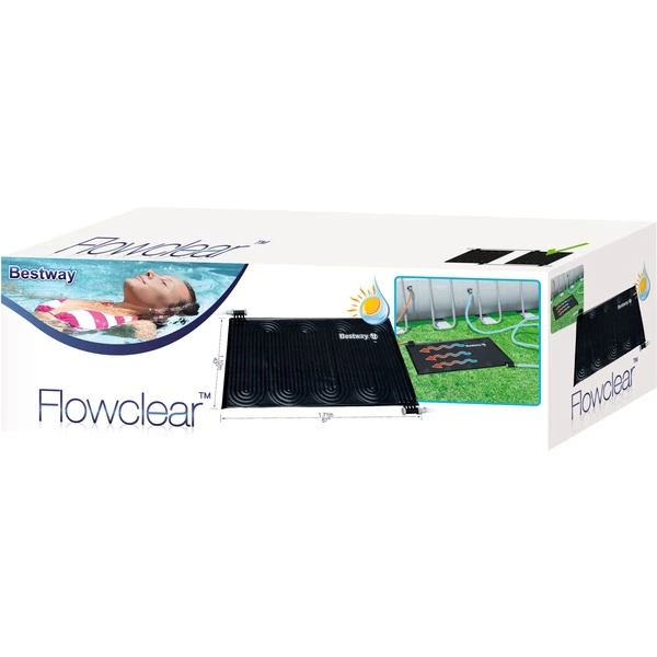Le chauffe-piscine solaire Flowclear de Bestway est un moyen écologique et économique de chauffer l’eau de la piscine. Il est facile à mettre en place avec les adaptateurs 32 ou 38 mm fournis. Le chauffage solaire augmente la température de l’eau de 3 à 5 °C, en fonction des conditions météorologiques. Il est fabriqué en PVC de 0,9 mm, un matériau de haute technologie, solide et durable, avec une bonne résistance. Il a une surface de chauffe de 1,46 m² et, selon la taille de la piscine, plusieurs tapis peuvent être reliés entre eux. Les dimensions d’un tapis sont de 110×171 cm.