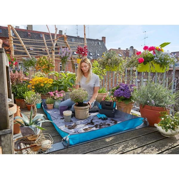 Avec le tapis de plantation GARDENA L, votre balcon et votre terrasse sont maintenus propres pendant la plantation. Le tapis est simplement posé sur la table ou sur le sol. Tous vos attributs importants tels que les pots, les pelles à main et le terreau peuvent être placés par-dessus et vous pouvez facilement planter et rempoter sur le tapis. La genouillère facilite également le travail et protège vos genoux. Le tapis de plantation est constitué d’un tissu textile hydrofuge, il est facile à nettoyer et peut être plié pour gagner de l’espace de stockage après utilisation.