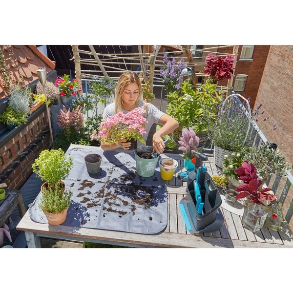 Avec le tapis de plantation GARDENA S, votre balcon et votre terrasse restent propres pendant la plantation. Le tapis est simplement posé sur la table. Tous vos attributs importants tels que les pots, les pelles à main et le terreau peuvent être placés par-dessus et vous pouvez facilement planter et rempoter sur le tapis. De cette façon, le substrat est protégé et les débris de terre et de plantes qui tombent pendant la plantation peuvent être collectés et ensuite facilement éliminés. Le tapis de plantation est fabriqué en tissu textile hydrofuge, il est facile à nettoyer et peut être plié pour économiser de l’espace de rangement après utilisation.