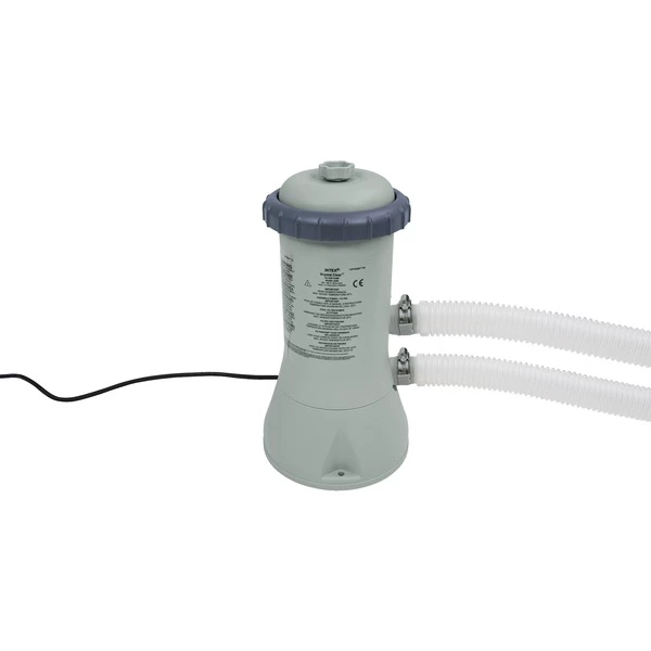 Le filtre à cartouche ECO 638G d’INTEX fournit une eau cristalline et un très bon résultat de filtration. Ce système, modèle 638G, a une capacité de circulation de 2.650 l/h ou une capacité de pompe de 3.406 l/h, le raccordement est de 230/12V/90 W. La cartouche filtrante utilisée est de type A, et toutes les piscines hors sol disponibles dans le commerce avec un raccord de tuyau de Ø 32 mm peuvent être raccordées. 2 tuyaux de piscine d’une longueur de 1,50 m, (diamètre) 32 mm y compris les colliers de serrage, 2 traversées, 1 grille d’aspiration et une buse d’entrée pour les piscines INTEX sont inclus dans la livraison. Le système de filtration peut être utilisé jusqu’à une température d’eau maximale de 35°C.