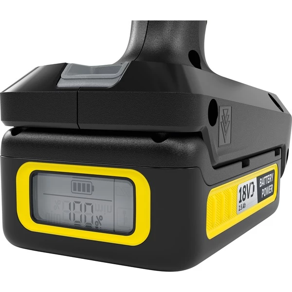 Pas de prise de courant ? Pas de problème ! Le nettoyeur moyenne pression portable sans fil et léger KHB 6 Battery de la plateforme Kärcher Battery 18 V permet de nettoyer pratiquement tout autour de la maison sans dépendre du réseau électrique. Il suffit de raccorder le flexible pour commencer à travailler. La buse à jet plat permet de débarrasser le mobilier de jardin, les jouets et bien d’autres objets des salissures gênantes, rapidement et en douceur. Vos bacs à fleurs sont tachés de pollen et de terre ? Voilà une mission pour la buse rotative efficace qui vient aisément à bout des salissures importantes. Les deux buses sont incluses. La batterie lithium-ion interchangeable endurante et puissante (18 V/2,4 Ah) et le chargeur sont disponibles comme accessoires spéciaux. La batterie lithium-ion interchangeable endurante et puissante est utilisable dans tous les appareils sans fil de la plateforme Kärcher Battery Power 18 V. L’afficheur LCD de la batterie indique, grâce à la technologie temps réel, la capacité restante pendant l’utilisation, la charge et le stockage. La vaste gamme d’accessoires augmente davantage la polyvalence du KHB 6 Battery. Ainsi, un canon à mousse, une brosse et un flexible d’aspiration pour utiliser l’eau de sources alternatives sont par exemple disponibles en option.