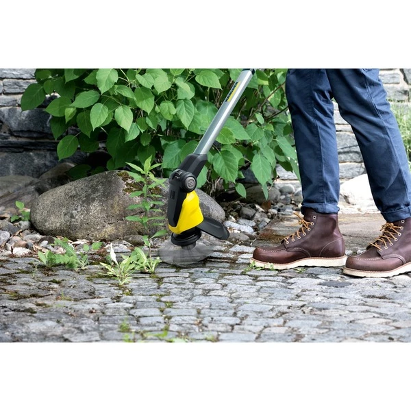 Grâce au désherbeur sans fil WRE 18-55 Battery Set de Kärcher, il est désormais beaucoup plus facile et plus rapide de désherber les surfaces et les chemins, tout en ménageant le dos et les genoux. Il n’a pas besoin de câble électrique, ce qui facilite grandement le nettoyage autour de la maison. Le désherbeur ergonomique gagne la bataille contre les mauvaises herbes dans les joints, les fissures et sur les surfaces grâce à sa tête de brosse rotative, son moteur puissant et sa puissante batterie lithium-ion interchangeable. La tête de brosse innovante à angle réglable avec système de changement sans outil est la pièce maîtresse du désherbeur WRE 18-55 Battery Set. Ses poils en nylon spécialement orientés éliminent efficacement, rapidement et durablement le mal des joints et des fissures. Les brosses atteignent une vitesse de rotation élevée contre laquelle les mauvaises herbes n’ont aucune chance. Le désherbeur est facile et confortable à utiliser et peut être réglé en fonction des différentes tailles et besoins. La demi-sphère pivotant à 360° sur le bouchon est une aide de guidage qui favorise une position de travail optimale et économise les forces. Lors des pauses de travail, l’appareil peut être déposé en toute sécurité sur le capot de protection. Grâce à l’œillet de suspension intégré, le WRE 18-55 Battery Set peut être facilement accroché à un crochet au mur après le travail.